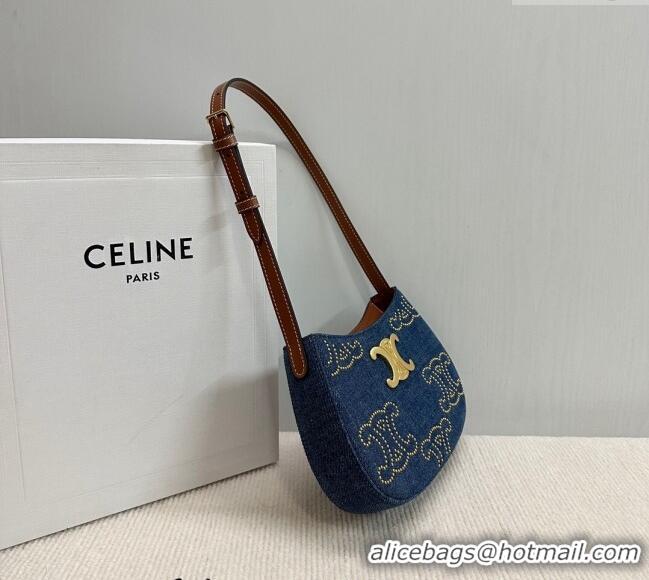 Discount Celine Medium Tilly Hobo Bag with Triomphe Studs in Blue Denim Calfskin 115702 2024