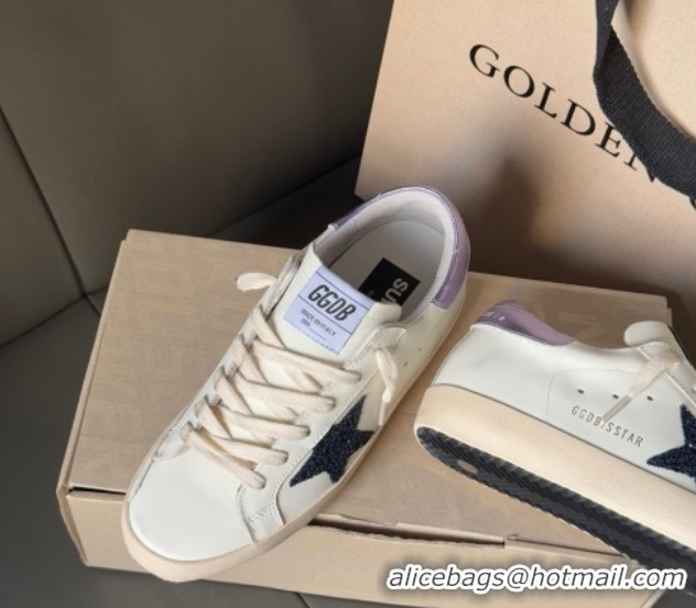 Discount Golden Goose Women's Super-Star in white leather with black glitter star and metallic purple heel tab 0902101