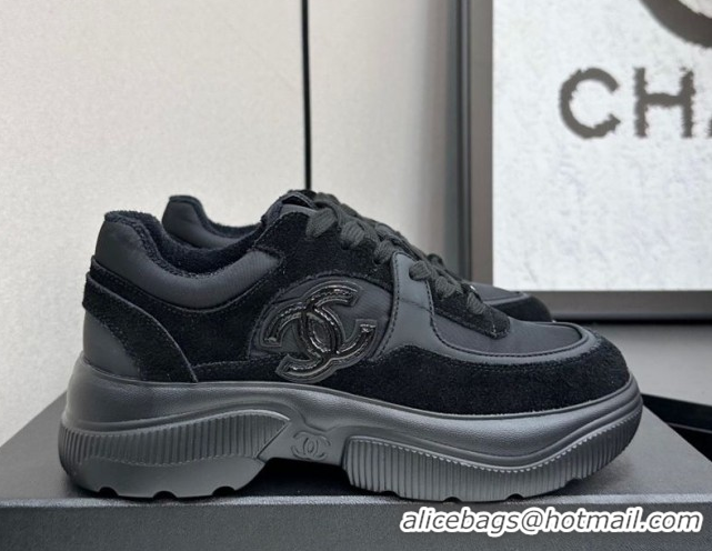 Stylish Chanel Calfskin Leather, Suede and Fabric Platform Sneakers All Black 2025 CH110102 1101009