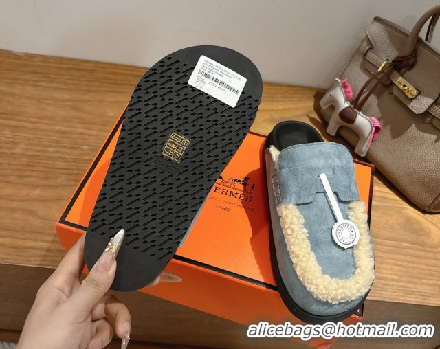 Sophisticated Hermes Go Flat Loafers in Suede and Wool with H Strap Blue 1023018
