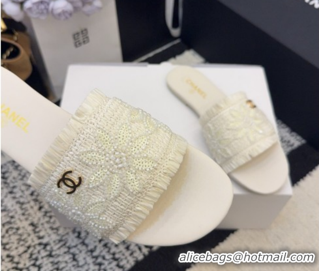 Top Design Chanel Bloom Straw-Like Flat Slides Sandal CH030701 White 2026