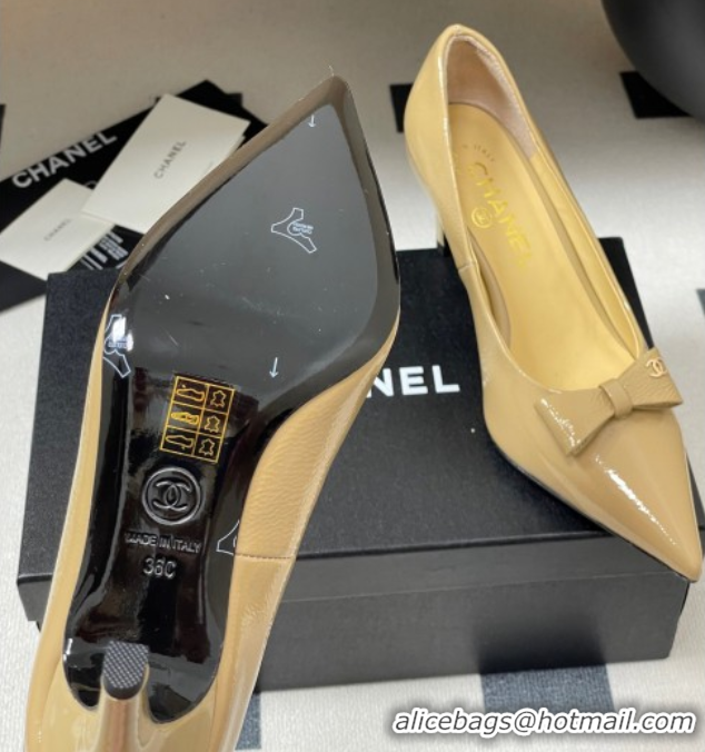 Durable Chanel Crumpled Patent Calfskin Pumps 7.5cm with Bow Beige G46547