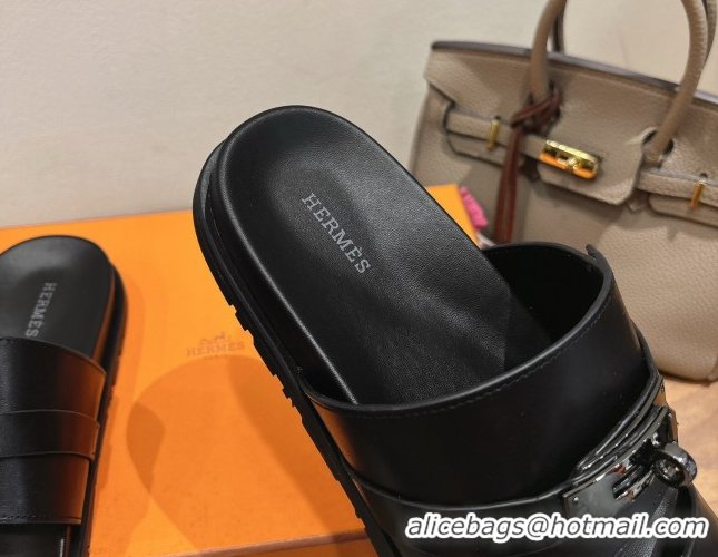 Durable Hermes Jackson Flat Slides Sandal in Smooth Calfskin All Black 2025 H082008 0820088