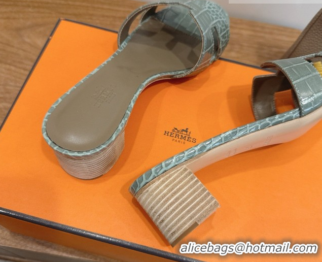 Top Grade Hermes Oasis Classic Heel Slides Sandal 4.5cm in Crocodile Embossed Leather Light Grey 0304050