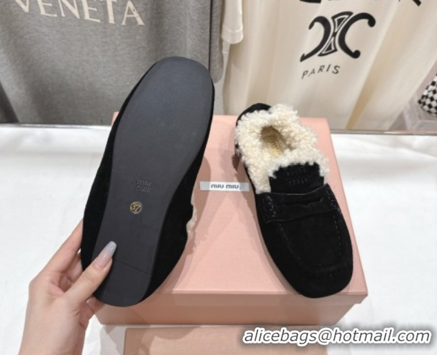 Popular Style Miu Miu Ruches Suede Loafers with Shearling Black 090605