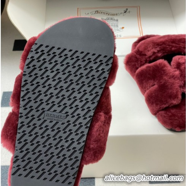 Fashion Hermes Chypre Flat Slides Sandal in Wool Burgundy H102306 1023115