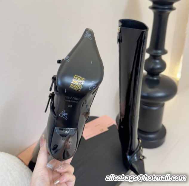 Fashion Luxury Miu Miu Patent Leather High Heel Boots with Strap Buckle Black MIU082603 0826017