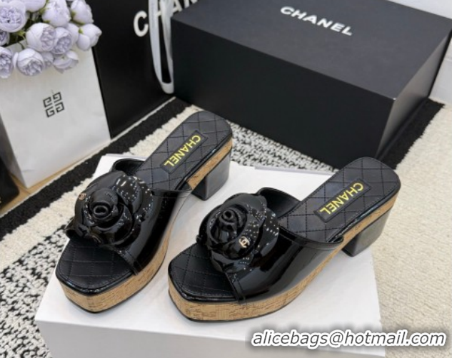 Good Looking Chanel Patent Leather Heel Slides Sandal with Camellia CH030616 Black 2026