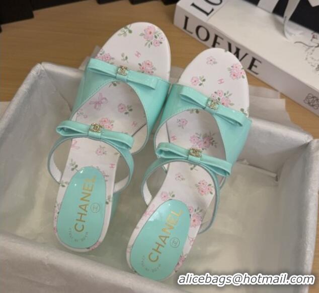 Luxury Cheap Chanel Patent Calfskin Heel Slides Sandal with Bow Light Green 2025 CH041604