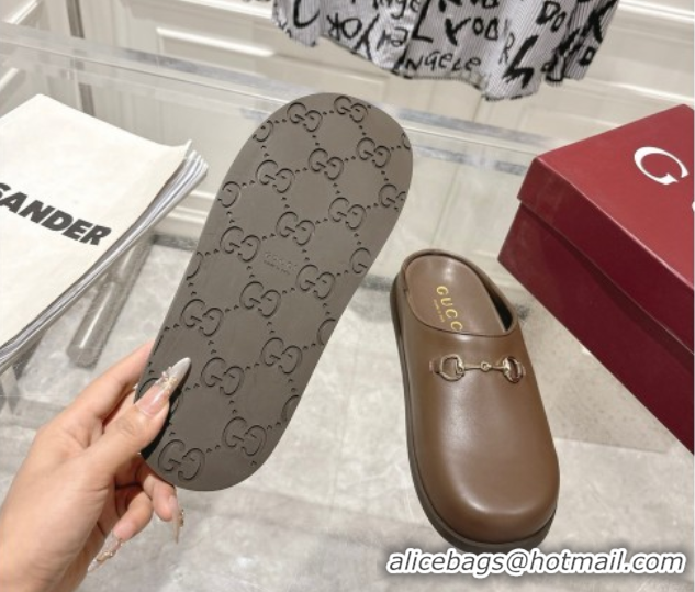 Good Quality Gucci Leather Flat Mules with Horsebit Coffee Brown 20252 836057 1020014