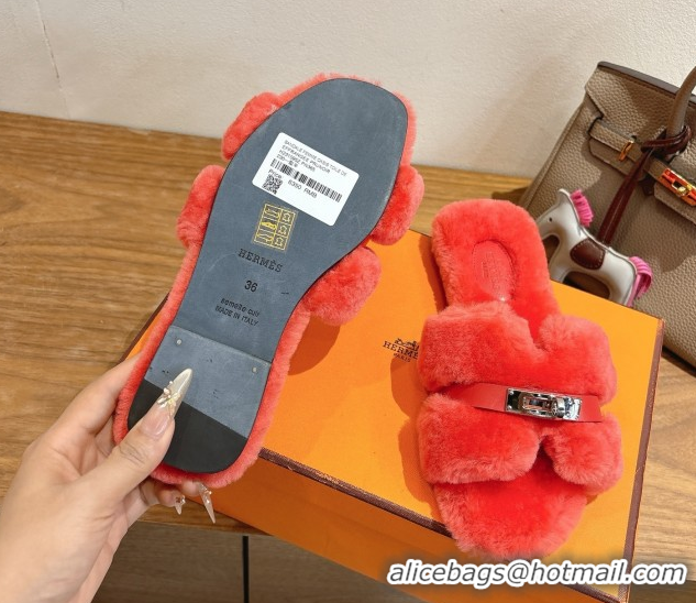 Best Price Hermes Oran Sandals in Shearling Wool with Kelly Buckle H101616 Red