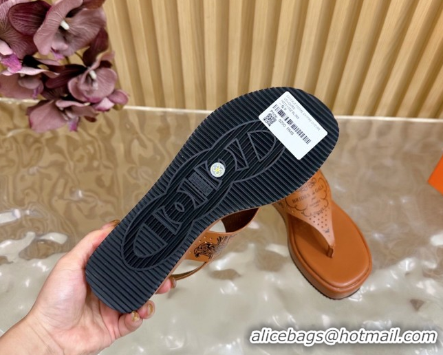 Cheap Price Hermes Printed Calfskin Leather Platform Thong Sandals Brown H102304 1023080