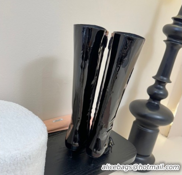 Top Design Miu Miu Patent Leather Low Heel High Boots with Buckle Black 2025 MIU082603 50826023