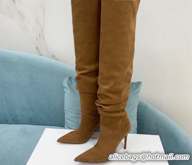 > Shoes Plaza > Amina Muaddi Shoes > Good Product Amina Muaddi Pleated Suede High Heel Boots 9.5cm Brown 100915