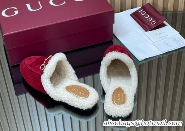 Good Product Gucci Princetown Suede and Wool Flat Slipper with Horsebit Red 1020031