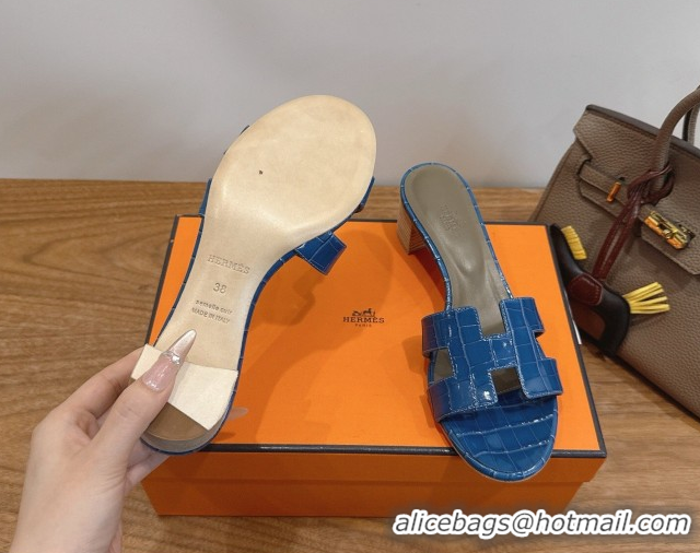 Popular Style Hermes Oasis Classic Heel Slides Sandal 4.5cm in Crocodile Embossed Leather Sky Blue 0304052
