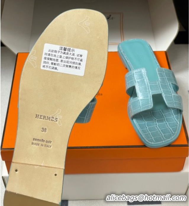 Cheap Price Hermes Oran Classic Flat Slides Sandal in Stone Embossed Calfskin Light Blue H081803
