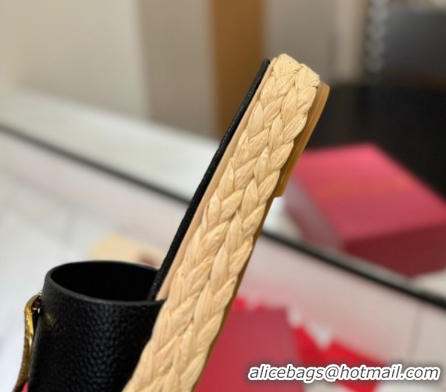 Good Product Valentino VLogo Grainy Calfskin Flat Slides Sandal Black/Gold VA082114