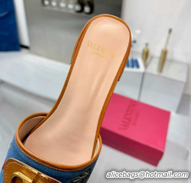 Good Product Valentino VLogo Signature Cherryfic Slides Sandal 3cm in Blue Denim and Leather Brown 1104094