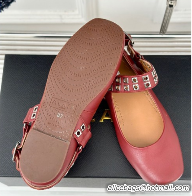 Good Quality Alaia Ballet Flats with Eyelet Studs and Buckle in Calfskin Burgundy AL100807 1008040