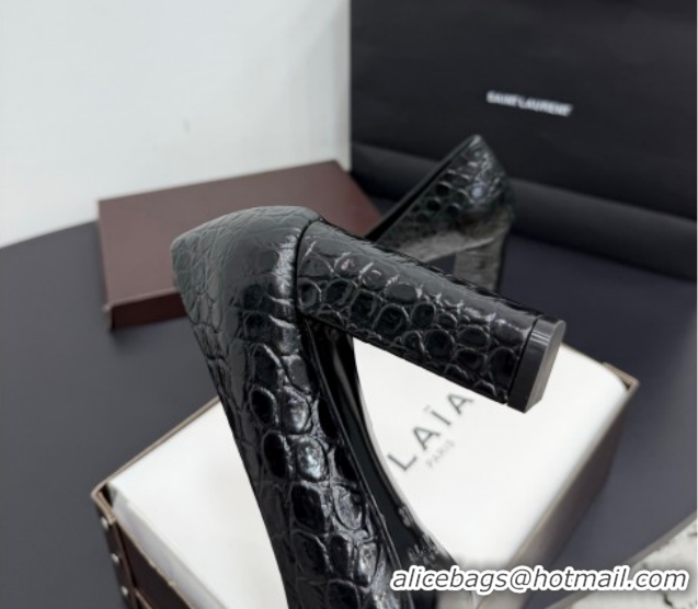 Good Quality Alaia Pointy Toe Pumps 9cm with Block Heel in Crocodile Embossed Leather Black 1029104