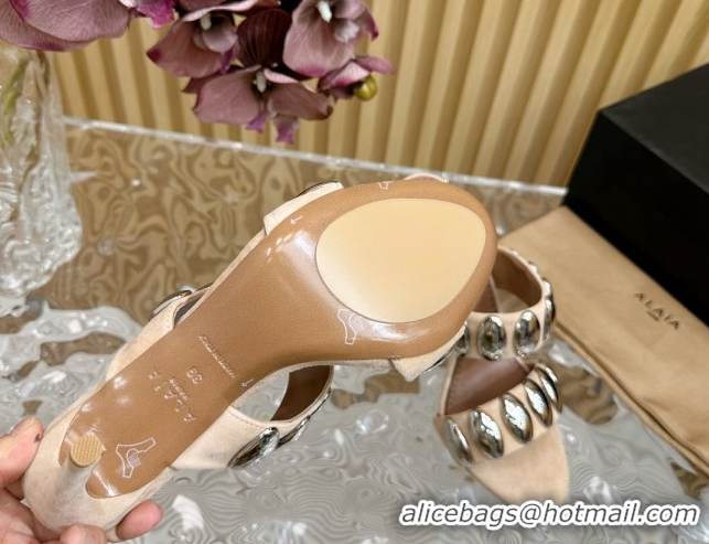 Grade Quality Alaia Tribal Suede Heel Slide Sandals 10cm with Metalic Pebbles Beige 1223052