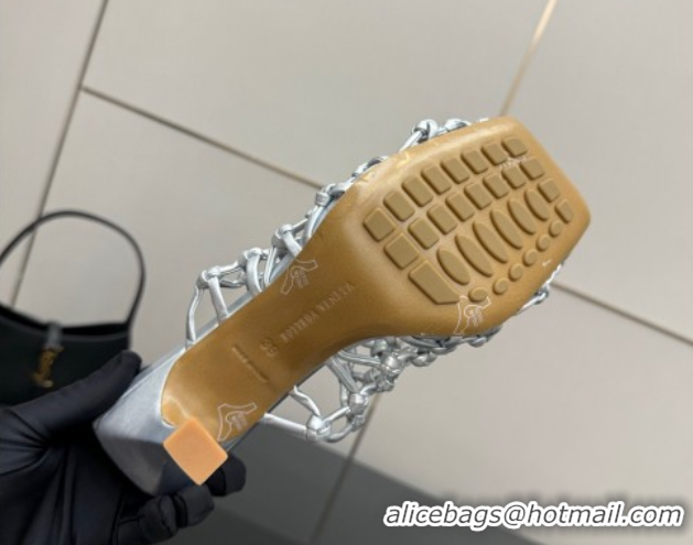 Stylish Bottega Veneta Riva Heel Mules 9cm in Woven Knotted Leather with Frog Charm Silver 50823002