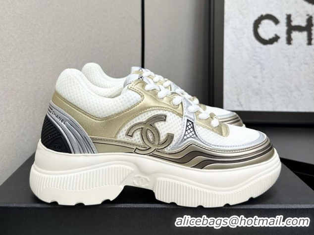 Top Design Chanel Calfskin Leather and Mesh Platform Sneakers White/Gold 2025 CH110104 1101037