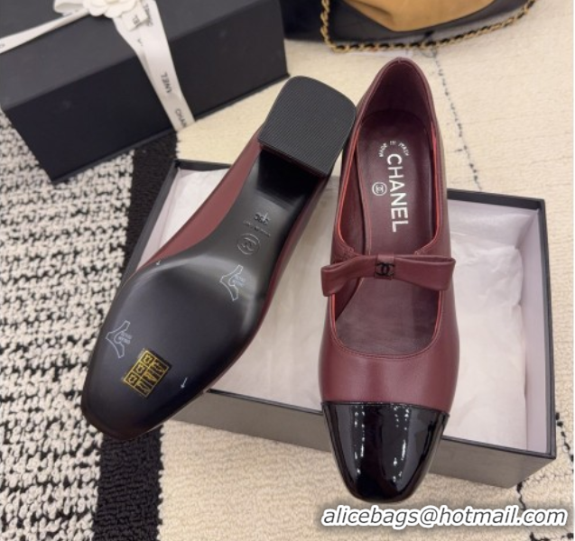Good Quality Chanel Lambskin and Patent Leather Mary Janes Pumps 5cm with Bow Burgundy 2025 CH110302 1103105