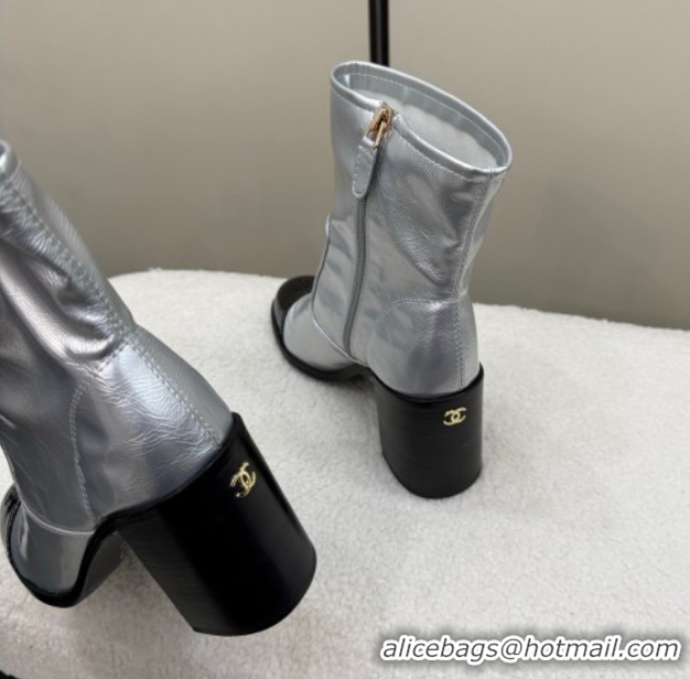 Luxurious Chanel Calfskin & Patent Leather Heel Ankle Boots 5cm Silver 2025 G46789 1104012