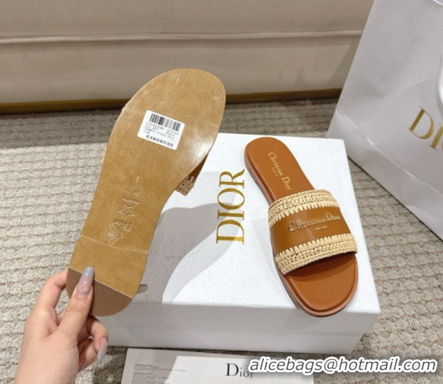 Cute Dior Dioriviera D-Lane Flat Slides Sandal in Calfskin and Braided Raffia Brown 0822106