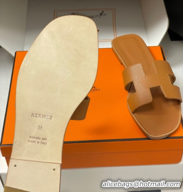 Unique Discount Hermes Oran Classic Flat Slides Sandal in Palm-Grained Calfskin Brown H081803