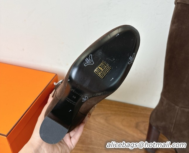 Good Quality Hermes Heel High Boots 9.5cm in Suede with Kelly Buckle Strap Dark Brown 1023052