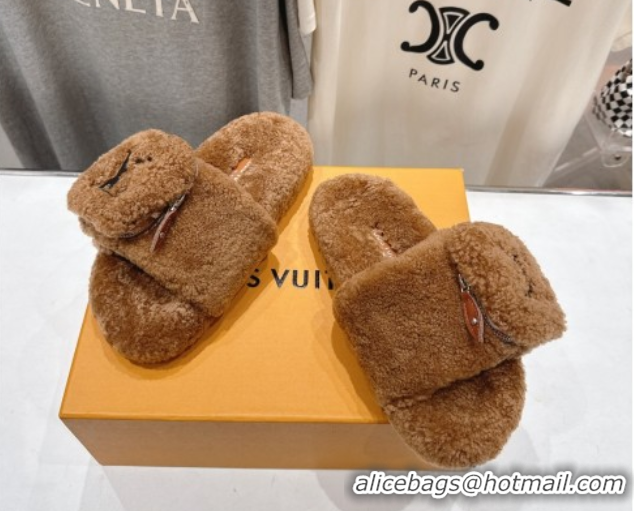 Good Quality Louis Vuitton Shearling Flat Slides Sandal with Zip Pouch Brown LV082905 0829109