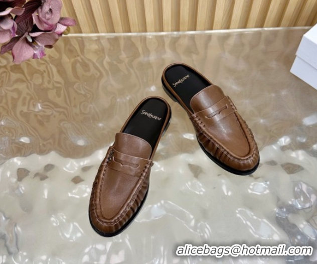 Good Quality Saint Laurent Le Loafers Mules in Creased Leather Dark Brown 0825095