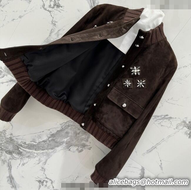 Luxury Cheap Miu Miu Sheepskin Suede Jacket with Strass 0814 Dark Brown 2025