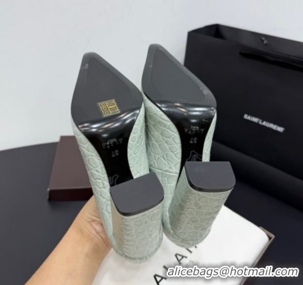 Grade Quality Alaia Pointy Toe Pumps 9cm with Block Heel in Crocodile Embossed Leather Light Green 1029105