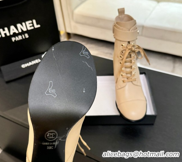Grade Quality Chanel Calfskin Leather Laced-up Ankle Boots with Chain Beige 2025 CH11030321 1103143