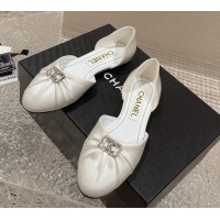 Luxury Chanel Satin Silk Flat Open Ballerinas with Crystal CC White 703065