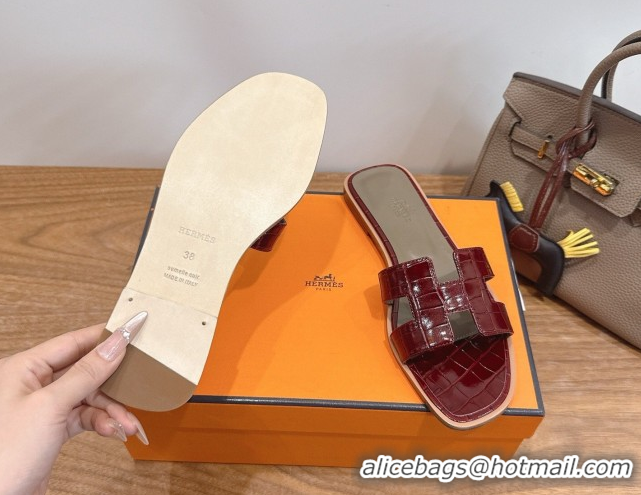 Pretty Style Hermes Oran Classic Flat Slides Sandal in Crocodile Embossed Leather Burgundy 0304058