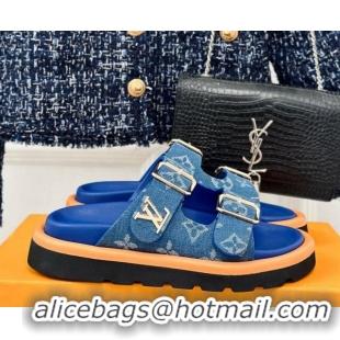 Grade Quality Louis Vuitton LV Flat Slide Sandals in Monogram Denim with Strap Blue 606179