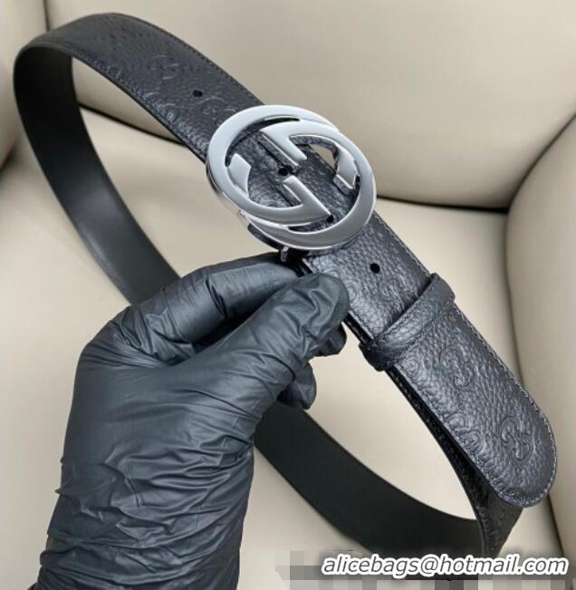 Discount Gucci GG Embossed Grained Leather Belt 4cm with Interlocking G Buckle GG010902 Black/Silver 2025