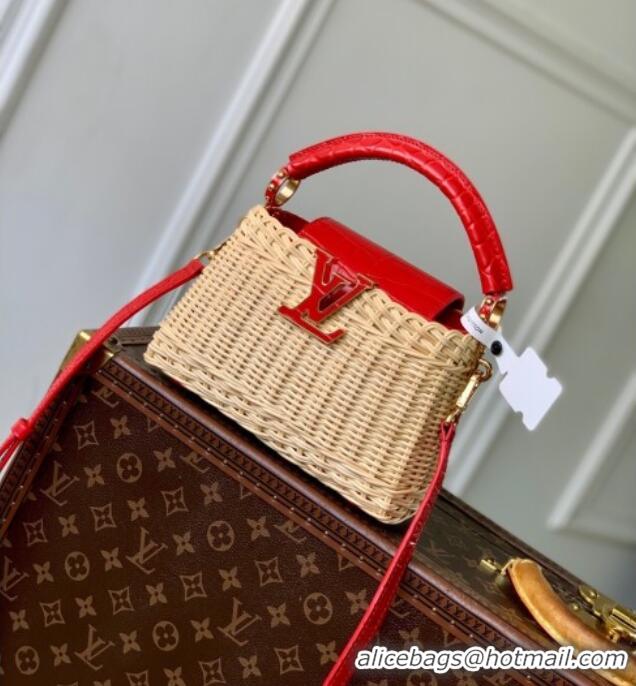Your Position: Home > Louis Vuitton Handbags > 2025 Louis Vuitton Bags > Inexpensive Louis Vuitton Capucines Mini Bag in Cowhide and Rattan N88126 Red 2025