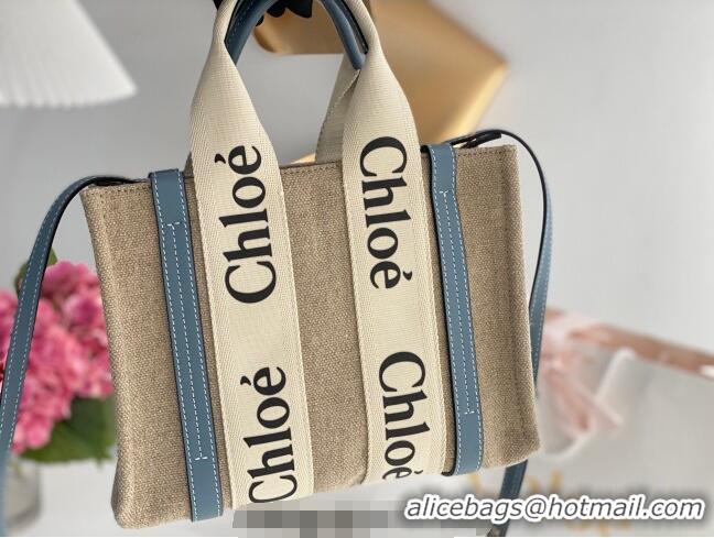Low Cost Chloe Small Woody Tote Bag in Linen Canvas and Calfskin Leather 1120 Denim Blue 2025