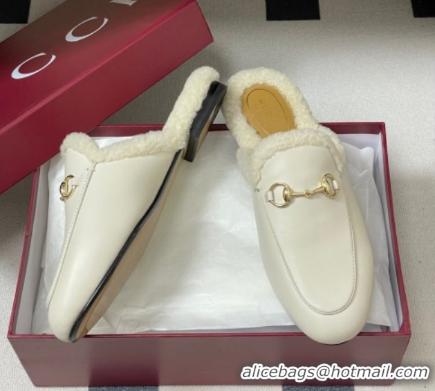 Charming Gucci Princetown Calf Leather and Wool Flat Slipper with Horsebit 836055 White 2026