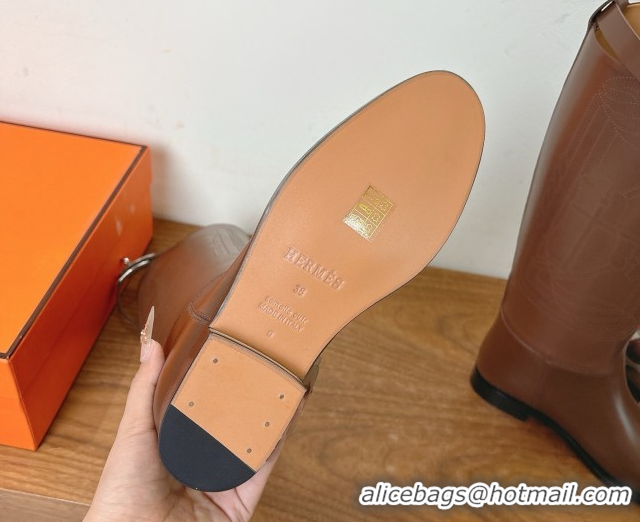 Low Cost Hermes Jumping High Flat Boots in Logo Perforated Calfskin with Kelly Buckle Dark Brown 1023047