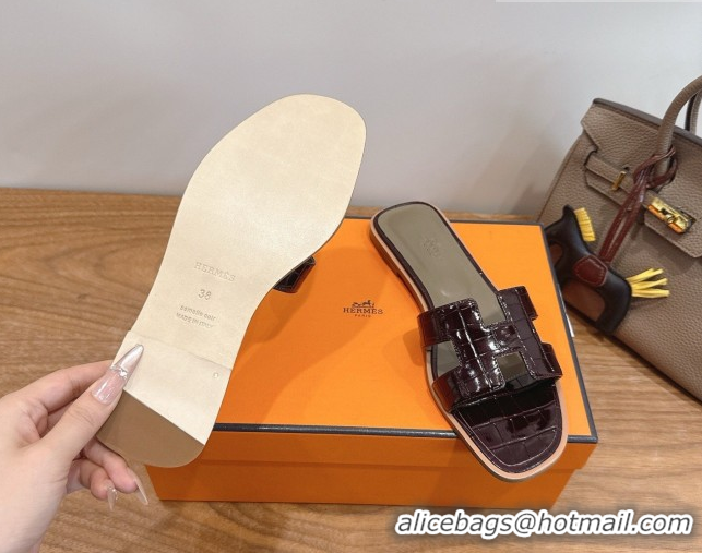 Perfect Hermes Oran Classic Flat Slides Sandal in Crocodile Embossed Leather Dark Burgundy 0304079