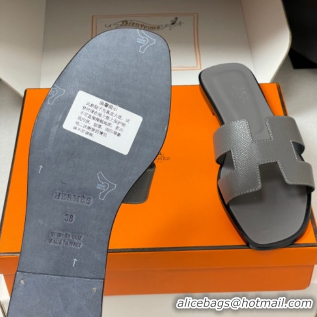 Sumptuous Hermes Oran Classic Flat Slides Sandal in Palm-Grained Calfskin Dark Grey H081803