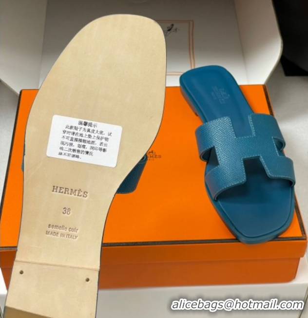 Low Cost Hermes Oran Classic Flat Slides Sandal in Palm-Grained Calfskin Denim Blue H081803