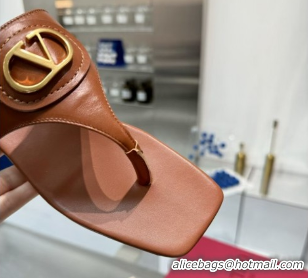 Low Price Valentino Vlogo Signature Flat Thong Slides Sandal in Calfskin Brown 0902060